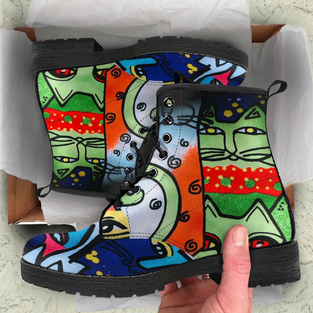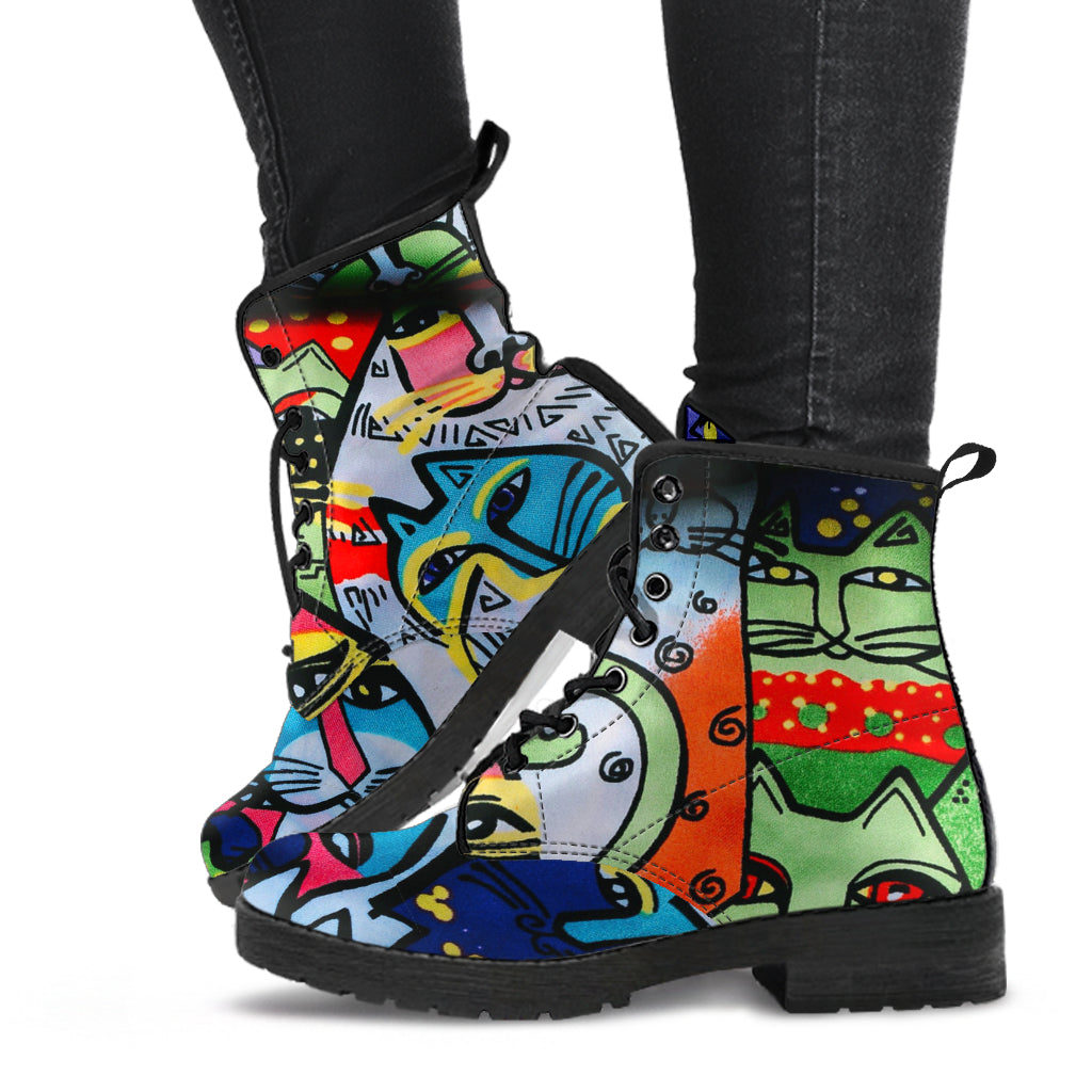 These Street Art Cats Women's Vegan Leather Combat Boots are the perfect combination of style and conscience. Made with vegan leather, they offer a trendy and cruelty-free alternative to traditional combat boots. Stand out with the unique street art cat design, while also supporting ethical and sustainable fashion choices. These boots are sure to make a statement and make a positive impact.
