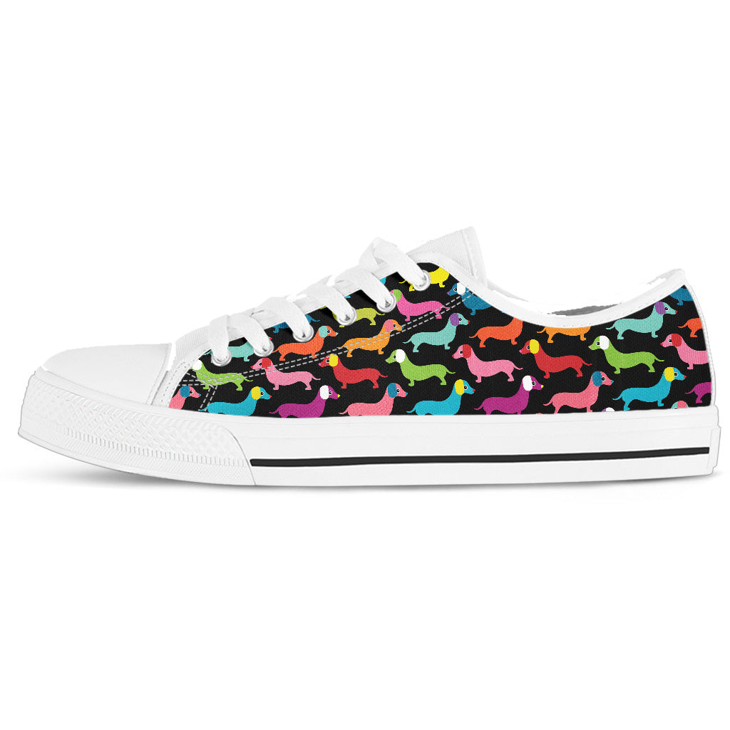 Get ready to strut your stuff with these playful Dachshund Rainbow White Women Low Top Sneakers! The unique design is sure to turn heads and the low top style offers maximum comfort for all-day wear. Walk with confidence and style in these quirky sneakers!